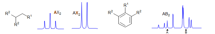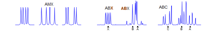 The analysis of complex NMR patterns is assisted by a general labelling method for spin systems introduced by Pople. Each set of chemically equivalent protons (or other nuclei) is designated by a letter of the alphabet. Nuclei are labeled AX or AMX if their chemical shift differences are large compared to the coupling between them (Δδ > 5J). Nuclei are labeled with adjacent letters of the alphabet (AB, ABC, MN or XYZ) if they are close in chemical shift compared to the coupling between them (i.e. if they are strongly coupled).