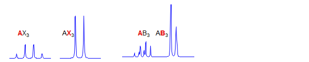 Second order. This is a very common pattern. JAB is directly measurable. The parameters JAX, JBX, νA and νB can be calculated from the line positions of the spectrum once it has been properly analyzed. Examples: 1, 2, 3, 5, 6, 7, 8, 9, 10, 11, 12, 13, 14, 15, 16, 17, 18, 19, 20, 21, 22, 23, 24, 25, 26, 27, 28, 29, 30, 31. see NMR Gallery ABX Spin system