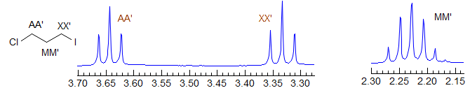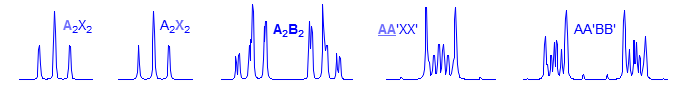 Second order. Common pattern. Can be solved by hand, but there are several ambiguities. For example, one cannot distinguish JAA' from JXX'. Significant parameters: JAA', JXX', JAX, JAX'. The AA' and XX' patterns are each centrosymmetric, and they are identical to each other, hence the inability to distinguish A from X parameters. A common type is X-CH2-CH2-Y, which is often just two triplets. Examples: 1, 2, 3, 4, 5, 6, 7, 8, 9. Also common are p-disubstituted benzenes. Examples: 1, 2, 3, 4, 5, 6.