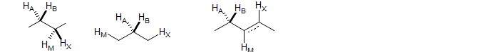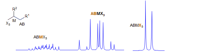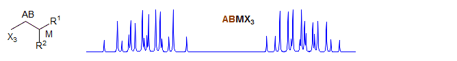 If R1 and R2 are vicinal then the AB part always has the appearance of the AB part of an ABX system, the M part is ddq, and the X3 part a doublet. Examples: 1, 2, 3, 4, 5, 6, 7, 8, 9, 10.