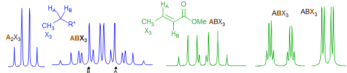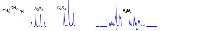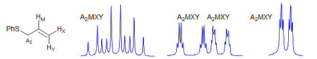Part structures like R1-CH2-CH-CH2-R3 are actually two ABX patterns which share a common X. If νAB and νXY are large enough they can be close to first order. Examples: 1, 2, 3, 4, 5, 6, 7, 8, 9, 10, 11, 12, 13. If R1 and R3 are the same, then the pattern is technically AA'BB'X but shows no unusual complexity because there is no significant coupling between the A and A' protons, nor between the B and B' protons. Such systems are better defined as (AB)2X to indicate that magnetic inequivalence is not a significant factor. Examples: 1, 2, 3, 4, 5, 6. This spin system also appears in HC=CH-CH-CH2.Examples: 1.