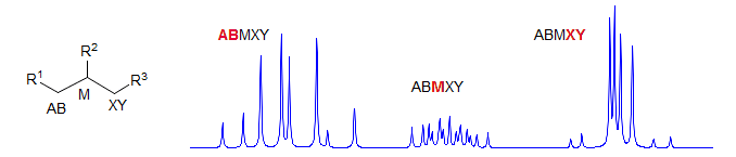 Seen in systems like -CH2-CH2-CH in chiral molecules. Can be first order if all the shifts are well separated, but gets very complicated if any of the coupled protons are superimposed. R2 and R3 must be different or one of the R groups must be chiral to get AB MN instead of AA' MM' patterns. Examples: 1, 2, 3, 4, 5, 6.