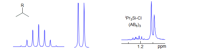 Common pattern: isopropyl groups in achiral molecules: (CH3)2CH-R where R is a heteroatom or a carbon bearing no protons (in chiral molecules, the CH3 groups will be diastereotopic, hence an A3B3X system). Technically, these are A3A'3X systems, but they are first order because there is no coupling betwen A and A'. Usually a septet and a doublet. Examples: 1, 2, 3, 4, 5, 6, 7. When R is a metal like Si or Sn the CH3 and CH protons can be close in chemical shift, and give a complex pattern (AB6) or even a singlet.