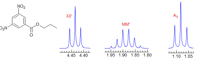 Not actually first order. However, a common type, n-propyl groups CH3-CH2-CH2-R, often appear to be nearly first order if chemical shifts are large enough, thus approximately two triplets and a sextet. Examples: 1, 2, 3, 4, 5, 6, 7, 8, 9, 10, 11.