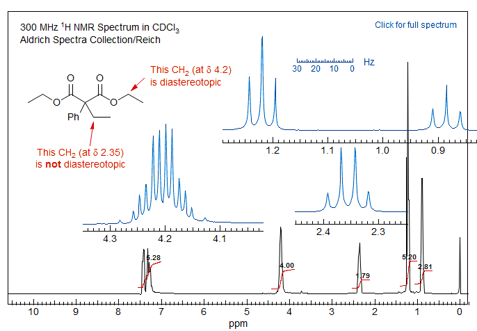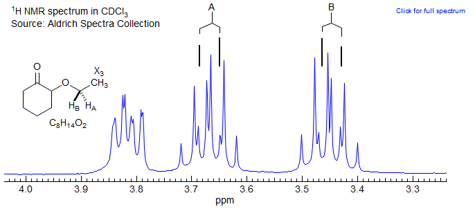 Most ethyl groups in chiral molecule will have diastereotopic CH2 protons, and thus form an ABX3 system. The partial 1H NMR spectrum of 2-ethoxycyclohexanone below illustrates a typical pattern. The A and B signals are well separated, and can be readily understood and solved as a first order "AMX3" pattern (each proton a leaning dq). Examples: 1, 2, 3, 4, 5, 6, 7, 8, 9, 10, 11, 12, 13.