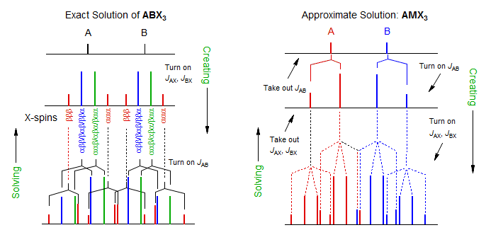 Just as for ABX systems, there is an exact solution, in which one first solves the four AB quartets, which are present in a 1:3:3:1 ratio (i.e., they represent the subspectra resulting from the four combinations of X spins: ααα; ααβ/αβα/βαα; αββ/βαβ/ββα; βββ). The solutions to these AB quartets give a 1:3:3:1 quartet for the A proton, and another for the B. These can then be solved as first order patterns.