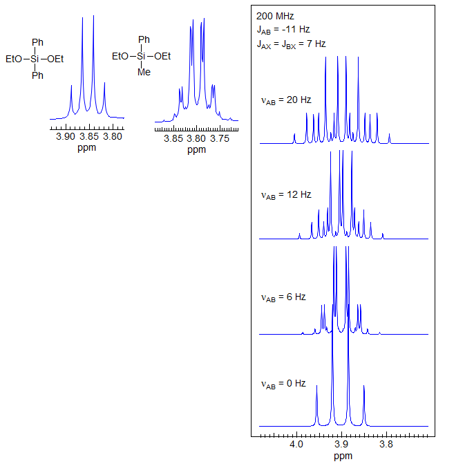 The simulated spectra shown mimic ABX3 patterns (AB part) of OCH2CH3 groups in chiral molecules. In these spectra all 16 of the lines are resolved, and recognition of the pattern is relatively easy. In real molecules it is common for several of the lines to be superimposed (especially since JAB is often nearly twice as large as JAX), making recognition of this pattern more difficult. In situations where the diastereotopic shift is small, the pattern can be mistaken for a quartets of doublets (see the νAB = 6 Hz spectrum).