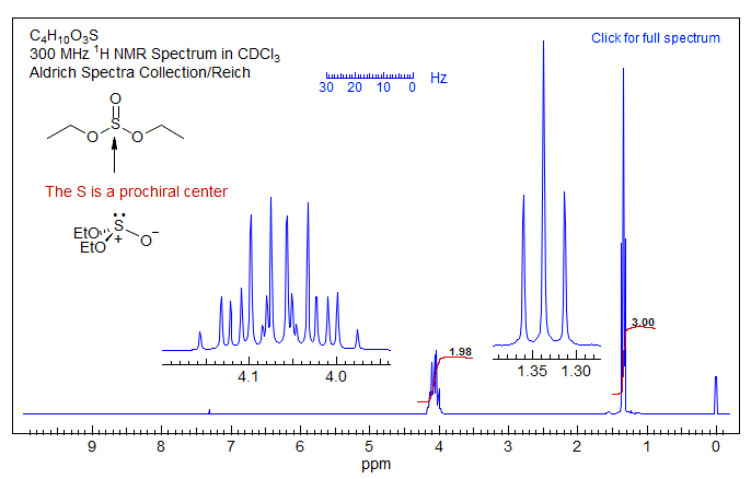 The spectrum of diethyl sulfite below is of historical interest - this type of diastereotopicity was first recognized for this molecule (Finegold, H. Proc. Chem. Soc., 1960, 283), with the correct explanation and analysis described in a classic paper (Kaplan, F.; Roberts, J. D. J. Am. Chem. Soc. 1961, 83, 4666), which also reported the first recognition that 2J and 3J at sp3 carbons have different signs. Diethyl acetals of aldehydes or diethyl ketals of unsymmetrical ketones also form ABX3 patterns.