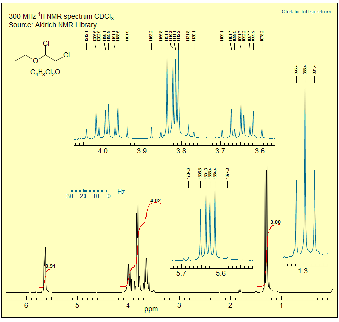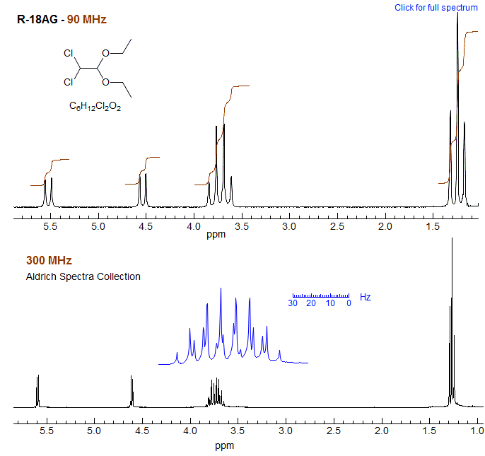 The spectra of dichloroacetaldehyde diethyl acetal illustrate that a molecule which contains diastereotopic protons can give decidedly simpler NMR spectra at low field than at high field. The CH2 group appears as a simple quartet at 90 MHz: the outer lines of the ABX3 pattern are too small to see, and the splitting of the inner lines is too small to resolve. At 300 MHz, on the other hand, the CH2 group is much more complex since HA and HB of the ethoxy are now far enough apart to give a well-developed ABX3 pattern.
