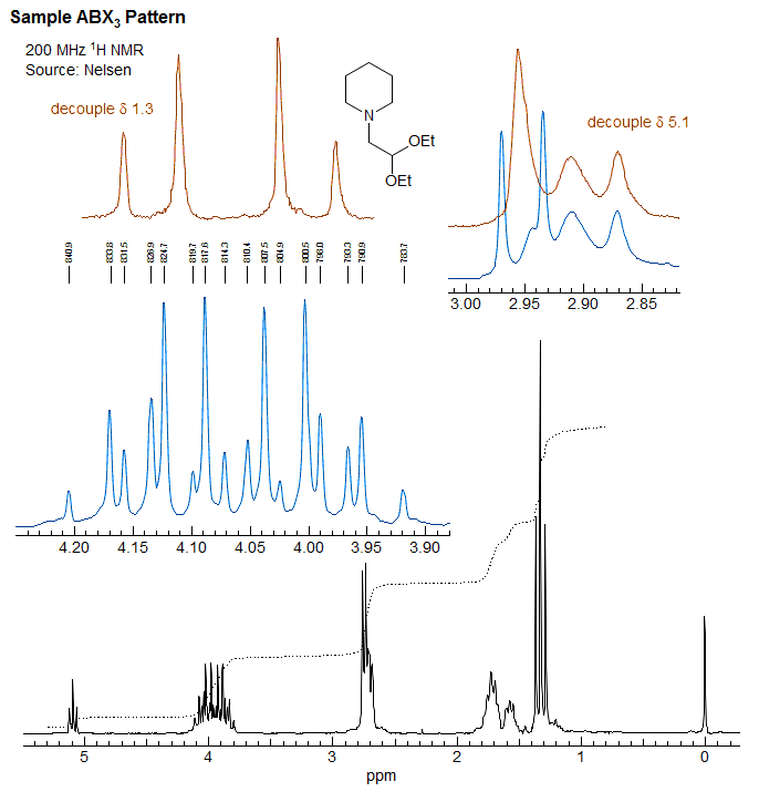 The spectrum of 3 below is of this type. One of the two dq of each proton is shown schematically above the simulation, which is plotted with a narrow line width so all of the lines can be resolved. Note that in this case the coupling of A and B to the X3 protons are identical, but A and B are coupled differently to the M proton. The M proton in addition also coupled to two others labeled P and Q.