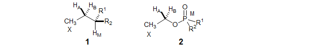 Spin system where the CH2 protons of a diastereotopic ethyl group are coupled to a proton (ABMX3) or other spin =1/2 nucleus can also be readily understood and analyzed by a simple extension of the ABX3 analysis. The CH2 of the ethyl group is an AB quartet, each line of which is first split into quartets from coupling to the CH3 protons. The quartets are then split again into doublets by coupling to M, giving a ddq for each of the CH2 protons. Some structure fragments which give such patterns are shown below. For 2 the M nucleus is the spin 1/2 phosphorus. In each case R1 and R2 must be different to make the CH2 group diastereotopic. Examples: 1, 2, 3, 4.
