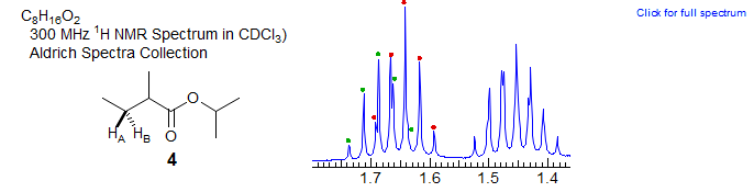 It is fairly common for ABMX3 patterns of the CH-CHAHB-CH3 type (1) to show nearly equal JAX, JBX, JAM and JBM. In this case the CHAHB group appears as an AB quartet of pentets. The partial NMR spectrum below shows the β CH2 signal of isopropyl 2-methylbutyrate (4). The downfield signal is a clean doublet of pentets, the upfield one closer to a ddq.