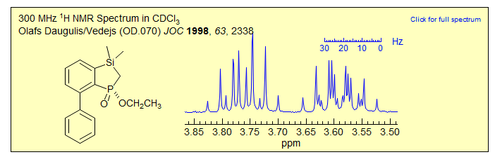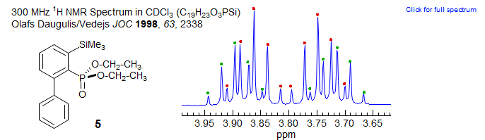 The phosphonate 5 has the diastereotopic OCH2 protons coupled equally to the CH3 group and the phosphorus, so here also a dp is seen for each proton (AB quartet of pentets). Related Examples: 1, 2.