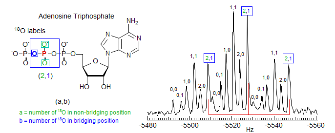 The isotope shift method provides a technique for the detection of NMR-transparent nuclei such as 18O. For example, the 31P NMR spectrum of a multiple-18O labeled sample of ATP (adenosine triphosphate) in Fig. 7.3.4 allows accurate measurement of numerous differentially isotopically labeled compounds.