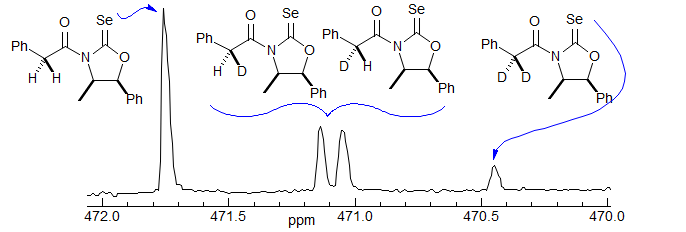Selenium-77 NMR chemical shifts are very sensitive to environment. Selenocarbonyls are especially so, covering a range of ca 2600 ppm. This property is potentially useful for detecting stereochemical and isotopic labeling of molecules. One system that has been developed (L. A. Silks, III, R. B. Dunlap, J. D. Odom J. Am. Chem. Soc. 1990, 112 ,4979-4982) is a selenocarbamate derived from nor-ephedrine. The derivative with α-deuterated phenylacetic acids shows a remarkable separation between the undeuterated, mono- and dideuterated isotopomers, and even the two epimers of the mono-deuterated compound! This for a D located 5 bonds from the Se.