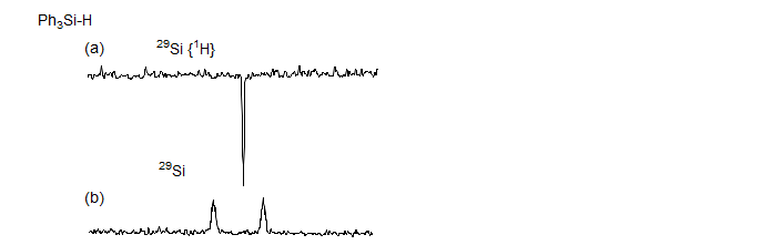 Figure 7.3.6. Proton-decoupled (a) and coupled (b) 29Si spectra of Ph3SiH, illustrating the negative NOE seen for the silicon signal (R. K. Harris, B. J. Kimber, Appl. Spectrosc. Rev., 1975, 10, 117)