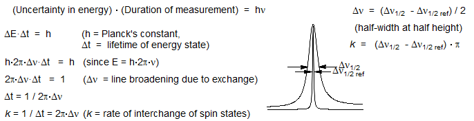 2. Dynamic NMR: Heisenberg uncertainty broadening of NMR signals occurs when two NMR transitions are interchanged by some physical process (spin-spin relaxation, T2) on a timescale equivalent to the separation of the two signals in Hz. That is, when there is uncertainty about the lifetime of a spin state (Δt), there is uncertainty about the energy (Δν), which causes line broadening. This is a unique capability of NMR spectrscopy, and many processes whose rates are easily measured by DNMR techniques are virtually impossible to study by any other method.