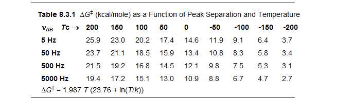 A consequence of these factors is that the accuracy of activation parameters is strongly affected by the line separation of exchanging signals, since the further apart the signals are, the wider the range of temperatures in which accurate rate measurements can be made, and the more accurate the rate constant will be (broader lines leads to more accurate simulations). This leads to more precise values for ΔS‡ and ΔH‡ derived from an Eyring plot.