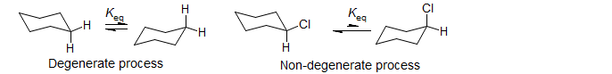 There is an important difference between the DNMR method and classical kinetic measurements: only processes which are at equilibrium can be studied. In the large majority of cases degenerate processes have been studied, i.e., processes for which starting material and product are identical, and Keq is by definition 1 (as in the cyclohexane inversion below). Non-degenerate processes (such as the chlorocyclohexane inversion) can also be studied, but it is important to recognize that there must be significant amounts of both species/signals present at equilibrium to see DNMR line broadening effects. Thus an NMR time scale interconversion between an observed species and a minor (<<1%) component will usually have no detectable effects on the NMR spectrum, no matter how fast or slow the rate is. For an analysis of the two-site very unequal population problem, see Anet, F. A. L.; et al. J. Chem. Soc., Chem. Commun. 1976, 399.