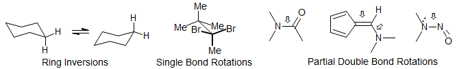 Rotation Around Bonds - Conformational Changes. Barriers to rotations around hindered single bonds can be conveniently measured by DNMR techniques. cyclohexane ring inversions, as well as those of larger rings are often in the DNMR rate range. Rotations around unhindered single bonds and the interconversion of various cyclopentane half-chair and envelope conformation are generally too fast (ΔG‡ < 5 kcal/mole) . Single bonds with partial double bond character (such as amide bonds), N-nitroso amines and double bonds with partial single bond character (such as aminofulvenes and push-pull alkenes) can be studied.