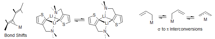 Ligand Reorganizations. Organometallic complexes with alkene, allyl, diene, pentadienyl, trienyl and other ligands can have multiple bonding sites, and interconversion among these can often be studied by dynamic NMR. This includes end-to-end of σ to σ and σ to π interconversion of allyl complexes, rotations of ethylene ligands, bond slippage along polyene chains, interconversion of octahedral isomers, and migration among other types of coordination sites in a ligand. Examples: 1.