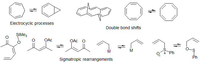 Molecular Rearrangements. Valence bond isomerizations such as the bullvalene and semibullvalene divinylcyclopropane Cope rearrangements, norcaradiene-cycloheptatriene and oxepin-arene oxide isomerizations, ring-chain tautomerization such as homoallyl-cyclopropylcarbinyl isomerizations, 1,2-, 1,3- and 1,5-hydrogen and metal (e.g. silyl) shifts, [2,3]sigmatropic rearrangements, double bond shifts.