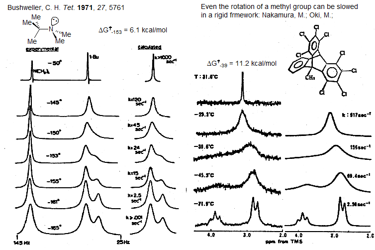Rotation around most single bands is too fast for DNMR rate measurements (ΔG‡ 2.5-5 kcal/mol). However, tertiary centers adjacent to secondary or tertiary sp3 carbons can have substantial barriers to rotation, easily measured by DNMR techniques. Hawkins, B. L.; Bremser, W.; Borcic, S.; Roberts, J. D. J. Am. Chem. Soc. 1971, 93, 4472. Examples: 1.