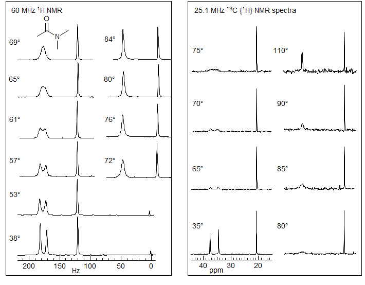 Amide Rotation. Among the most intensely studied molecular processes (using DNMR) is the restricted rotation around amide bonds, because of the importance of the phenomenon in peptide and protein structures and chemical behavior. Some typical spectra (1H and 13C) of a DNMR study of N,N-dimethylacetamide are shown below (from Abraham and Loftus). The two 1H N-methyl peaks have slightly different peak heights because there is apparently a small coupling between one of the N-Me groups and the C-Me group.