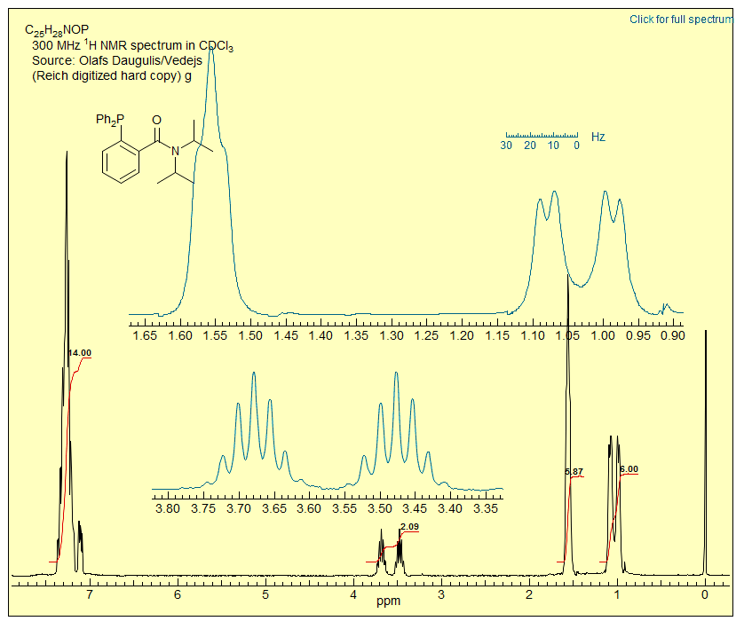 Exercise: (a) Explain the appearance of the CH region around δ 3.6. (b) Explain the appearance of the methyl region (HINT: there is restricted rotation around more than one bond.) Click on the spectrum for an analysis