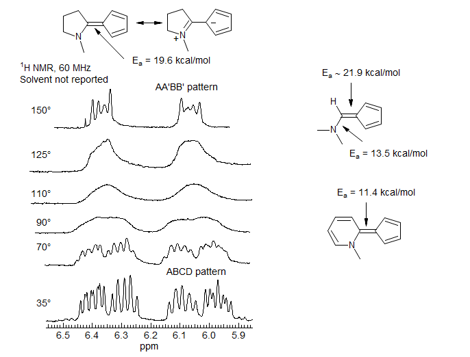 Aminofulvene Double Bond Rotation. The barrier to rotation around simple C=C double bonds are in excess of 50 kcal/mol, much higher than can be measured by DNMR methods. However, formal double bonds in structures which have significant resonance contributors with single bond character can show much reduced barriers to E/Z isomerization. The aminofulvenes below are molecules of this type. The very low barriers to E/Z isomerization indicate that the cyclopentadienide-imonium resonance structure is significant. This is also indicated by the substantial barrier to rotation around the C-NMe2 bond (as indicated by coalescence of the diastereotopic NMe2 group (-10 °C). (Crabtree, Bertelli J. Am. Chem. Soc. 1967, 89, 5384)