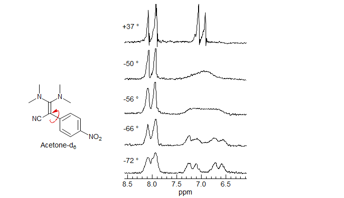 Push-Pull Double Bond Rotation. These diamino cyano alkenes show restricted rotation around 4 different bonds, three of them formal single bonds with double bond character, the fourth a double bond with single bond characater (H. Kessler Chem. Ber. 1970, 103, 973.)