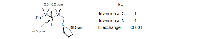 Pyramidal Inversion in a Carbanion Species. In the variable temperature 13C NMR experiment below of a chelated lithiumn reagent several molecular processes can be identified and their rates measured by DNMR. In the static pyramidal structure at low temperature both Si(Me)2 carbons are diastereotopic (four signals at δ 3 to 7). They begin to broaden above -80 °C as inversion becomes fast on the NMR time scale. Note that initially all four SiMe peaks broaden equally, but the pair that is closer together coalesces at a much lower temperature (Tc ca -50 °C) than does the other pair (Tc ca -30 °C). The inversion process does not involve any intermolecular exchange of Li ions, since the Li-C coupling (1:1:1:1 quartet at -7 δ) remains unaffected throughout the temperature range studied.