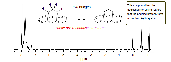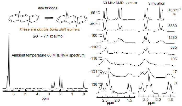 Annulene Double Bond Bhift. The syn bridged annulene is a delocalized aromatic (bis-homo anthracene) compound, as shown by the strong upfield shift of the bridging protons (δ -0.6 and -1.1), and the downfield vinyl protons. In the anti-bridged annulene conjugation is apparently not possible, since the NMR chemical shifts of the bridge protons are normal (δ 1.9 and 2.5). At room temperature the spectrum of the anti compound is symmetric, and shows only a single CH2 group. However, at lower temperatures decoalescence occurs, and two CH2 are seen at -138 °C (Vogel, E. Angew. Chem. 1970, 82, 510, 512). At this temperature the double-bond shift is slow on the NMR time scale. The activation energy for bond-shift is ΔG‡ = 7.1 kcal/mol. Thus the two representations are resonance structures for the syn compound, but valence-bond isomers in the anti.