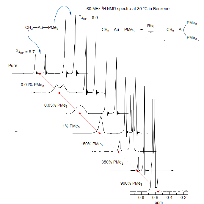 Phosphine Ligand Exchange in Gold Complex. DNMR experiments usually involve changing temperature to change the rates of molecular processes, but other variables which change rates and result in averaging of shifts and coupling constants can also be studied. In the series of spectra below, increments of PMe3 ligand were added to a solution of a gold-phosphne complex, which initiates a bimolecular exchange between bound and free ligands, causing loss of 3J coupling between the CH3-Au protons and P. Initially no change is detectable in the PMe3 protons because the fraction of free ligand is <1%. When a significant fraction of PMe3 has been added, however, the PMe3 signals move downfield because of averaging between free and bound ligand. The apparent coupling also decreases, and becomes 0 at 350% PMe3. Coupling between H and P reappears when 9 equivalents of PMe3 have been added, with J close to that of the pure ligand (2.6 Hz). This shows that 2JHP has opposite signs in the free and bound ligands (Shiotani, A.; Klein, H. F.; Schmidbauer, H. J. Am. Chem. Soc. 1971, 93, 1555).